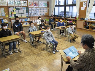 今朝の読み聞かせは、地域サポーターの末武さんと藤田(英子)さん。子どもたちの心に染み込むように、穏やかな口調で読んでいただきました。